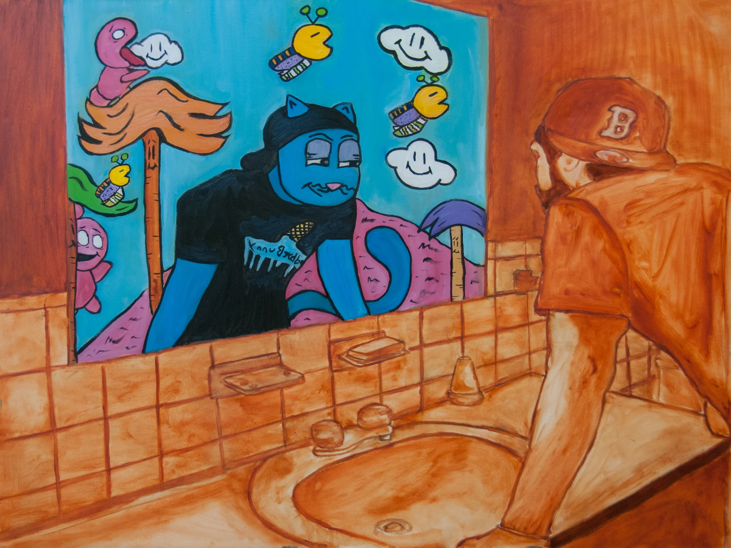 Oil Painting. Reality is all in browns, but the reflection of myself, my imagination, is my cartoon character from Couch Surfers who represents me.